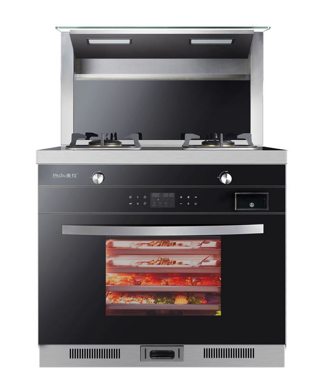 烟机:40叠铜线电机,280x100mm风轮,一体风箱,金属风道,铝塑复合烟管,上置加热暖菜保温平台。